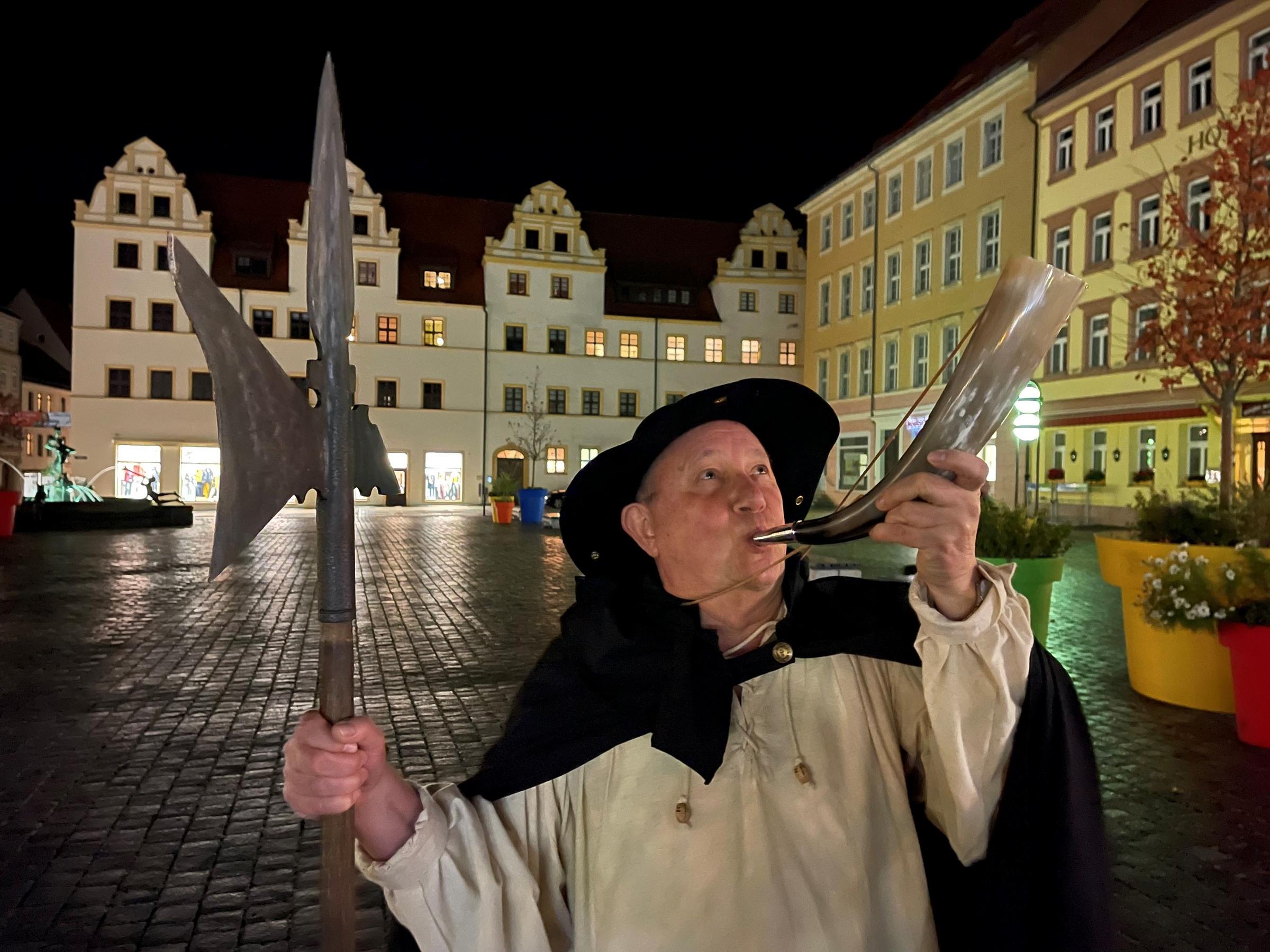 Wenn abends Punkt acht das Horn vor dem Rathaus ertönt, beginnt eine Reise in die Vergangenheit. In seinen dunklen Mantel gehüllt, mit breitem Hut und flackernder Laterne, erscheint der Nachtwächter und lädt zu einer atmosphärischen Führung durch die Gassen Torgaus ein.